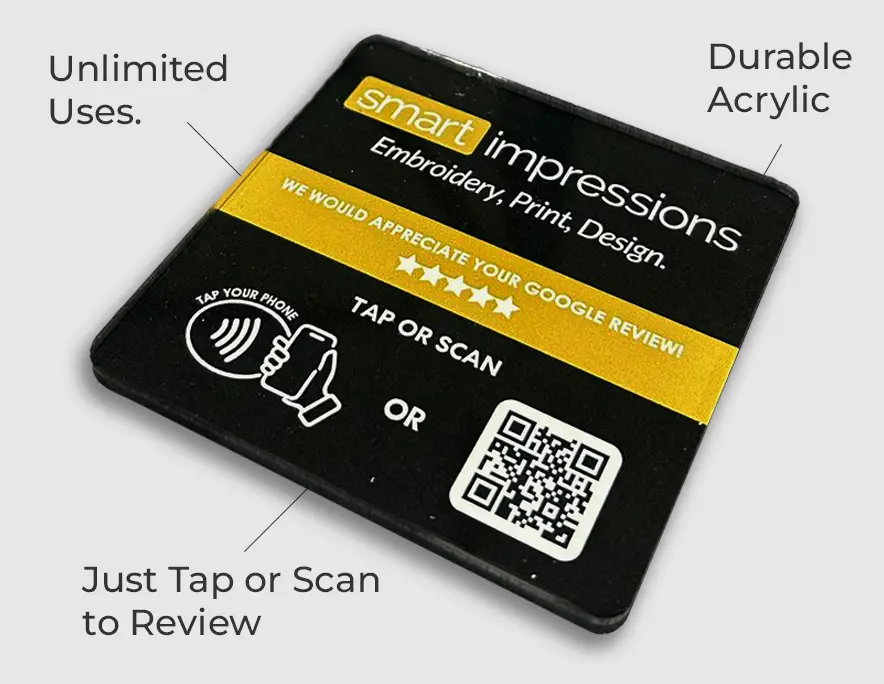 Boost your online reputation with our “Tap or Scan to Review”. Simply tap with a phone or scan the QR code to direct customers straight to your review page—no hassle, no searching.